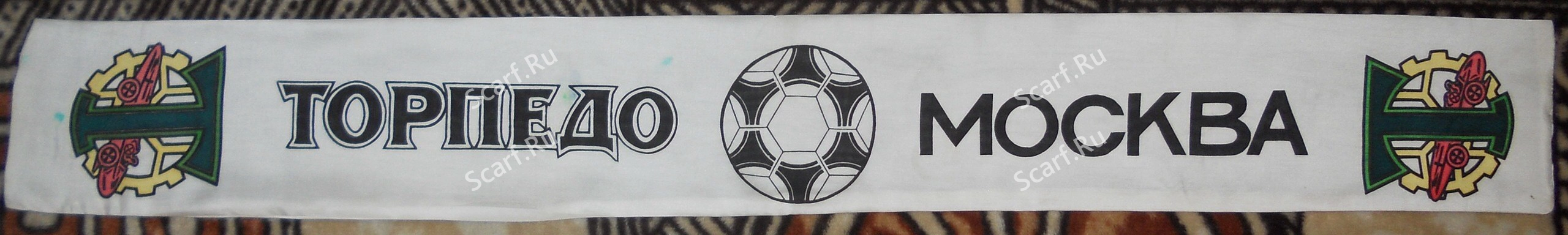 Торпедовская лента 1991 года выпуска, представляющая из себя широкий прямоугольник синтетической ткани, сложенный пополам и простроченный по краям. С одной стороны краской проштампованы надписи и рисунки. Кистей нет.